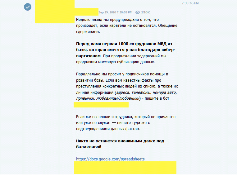 Nexta说:“如果你知道名单上某些人的犯罪事实,以及他们的个人信息(地址、电话、车牌号、生活习惯、情妇/情人),给我们留言。”