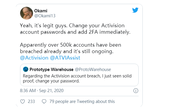 “动视暴雪的一次重大黑客攻击导致数百万用户陷入困境,所有《使命召唤》的玩家都应该注意了。”Dexerto发布的帖子中写道。