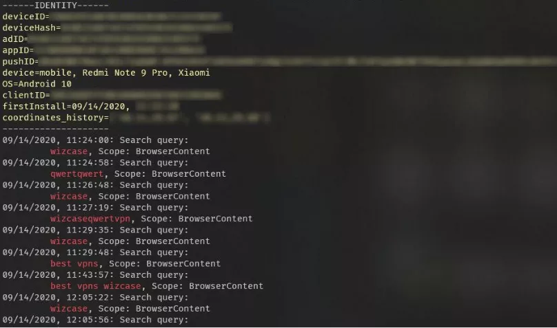 该服务器还显示了执行搜索查询的搜索条件(存储在纯文本),精确的位置(如果启用应用程序位置许可权限-坐标在500米的范围内位置数据),确切时间、设备型号、Firebase通知令牌(让开发人员可以将通知发送到某个特定设备)、用户从搜索结果中选择访问的URL列表以及优惠券数据(包括复制代码时的信息)。