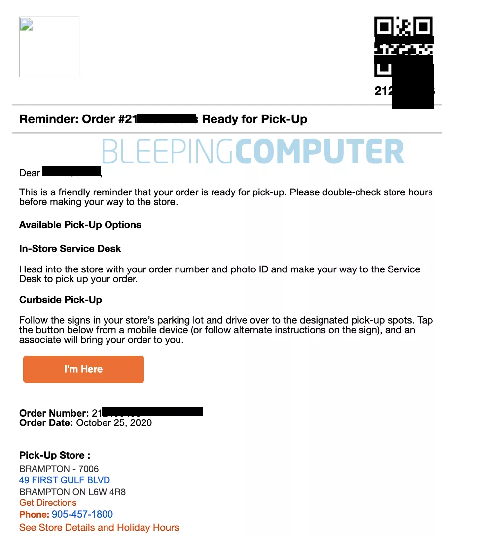 电子邮件内容显示了客户的姓名、二维码订单号、取货店地址等信息,在某些情况下,还会显示客户的家庭住址、订单中的物品以及部分付款卡号后4位数字的付款收据。