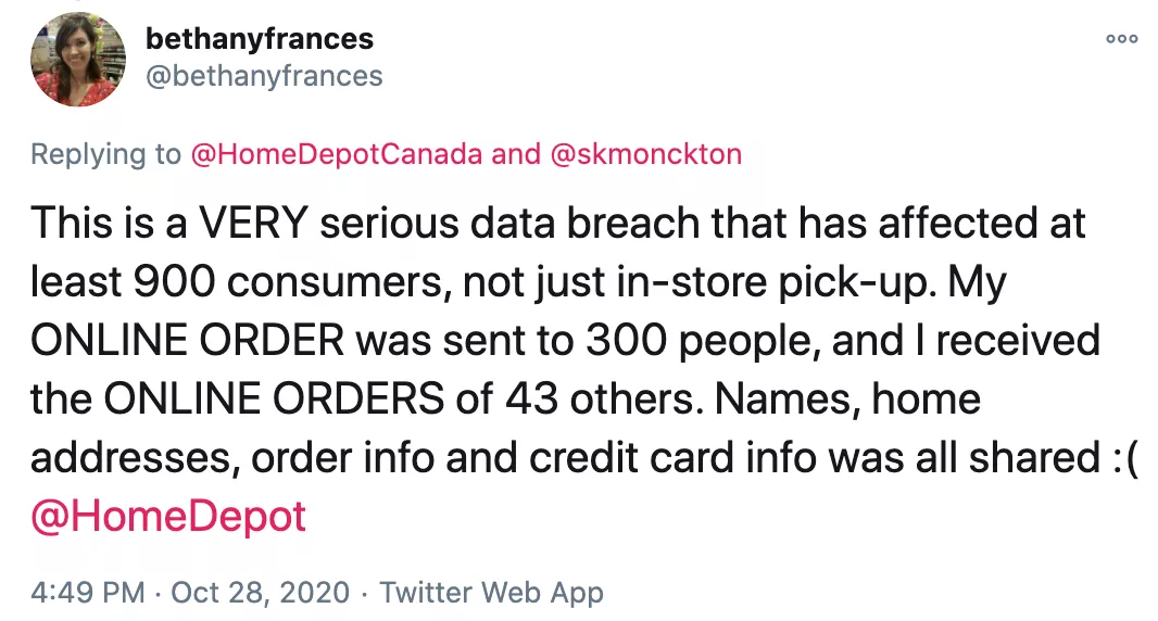 家得宝加拿大公司(Home Depot Canada)将数百封与客户账户无关的订单信息电子邮件发送到了客户的收件箱 来源:Twitter