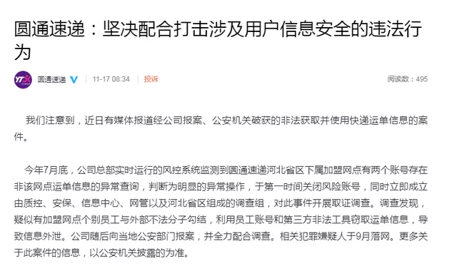11月17日,针对圆通“内鬼”,致40万条个人信息泄露一事,圆通速递有限公司官方微博回应: