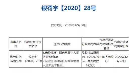 2020年12月31日消息,中国人民银行公布的行政处罚公示表显示,鹏元征信有限公司因未经批准,擅自从事个人征信业务活动;企业征信机构任命高级管理人员未及时备案,没收违法所得1917.54万元,并处罚款62万元,罚没合计1979万余元。