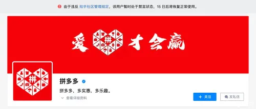 1月5日,根据网友爆料,知乎网页显示,由于违反知乎社区管理规定,拼多多的知乎官方账号被禁言15天。