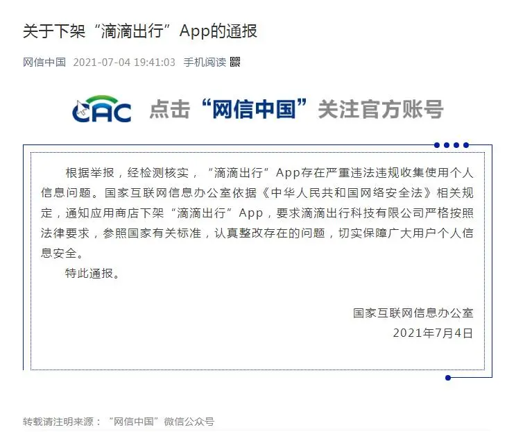 7月4日,国家互联网信息办公室,通过其官方微信公众号“网信中国”通报下架“滴滴出行”App。